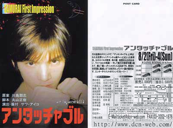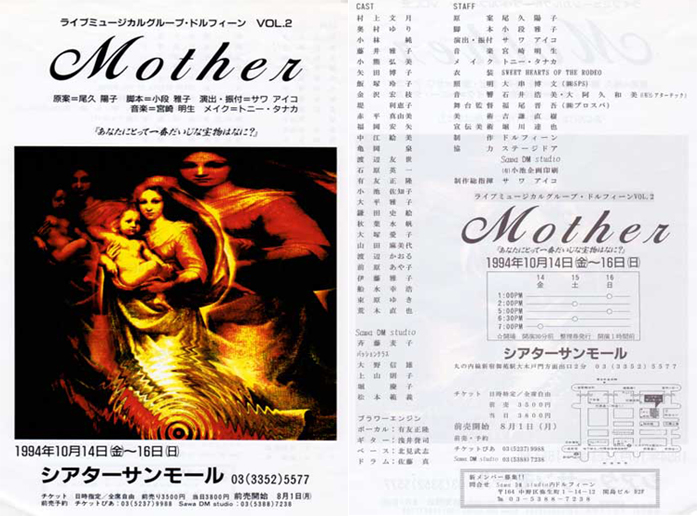 ドルフィンプロダクション 第1回公演 『あなたとはいずれ決着をつけなくちゃと思っていたのよ』 代官山 ボールルーム 観客動員数:約1500人 制作総指揮者:サワアイコ 照明:佐々木陸夫 (株)SPS 音響:岡田清孝 舞台監督:岩田広明 音楽:宮崎明生 メイク:トニータナカ 宣伝美術:国塔 泉 制作:ドルフィーン 協力:ボールルーム・(株)SPS・ステージドア・SAWA DM STUDIO 【CAST】 村上文月・奥村由里・小林 純・藤井雅子・小熊弘美・矢田博子・飯塚玲子・堀川圭美・金沢宏枝 石原栄一・有友正隆・松本朋子・小池 中(ピアノ) 堤 利恵子・広瀬雄一郎・赤平真由美・福岡安矢・星 真輝・中江絵美・亀岡 泉・井畑義人・渡辺友世 ステージドア:大野信雄・岡田恭子・上山則子・瀬戸口ミサカ・田近紀久子・堀 慶子 |